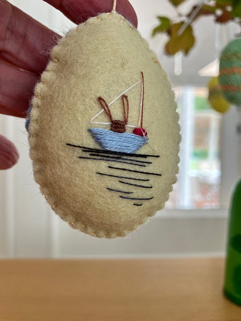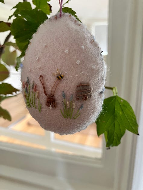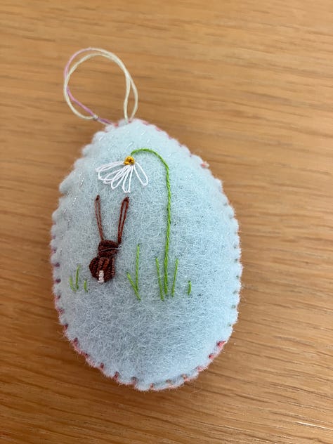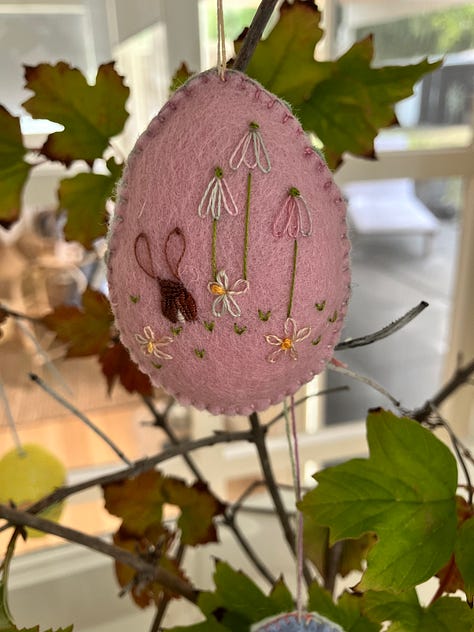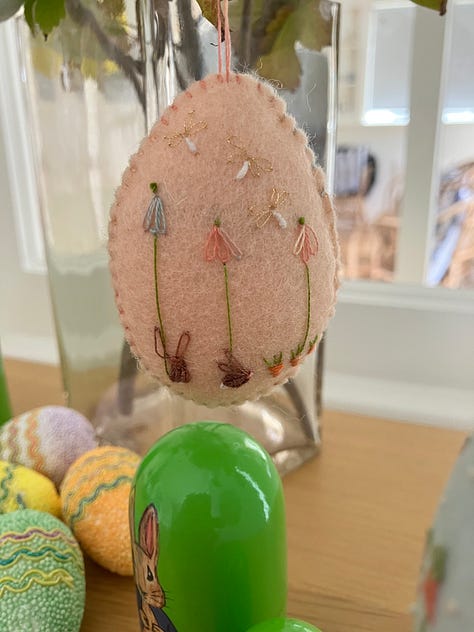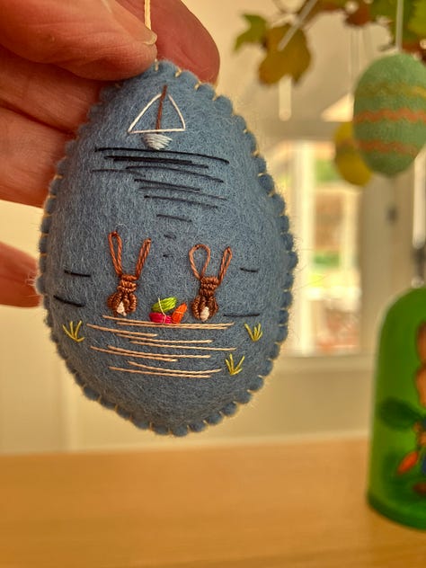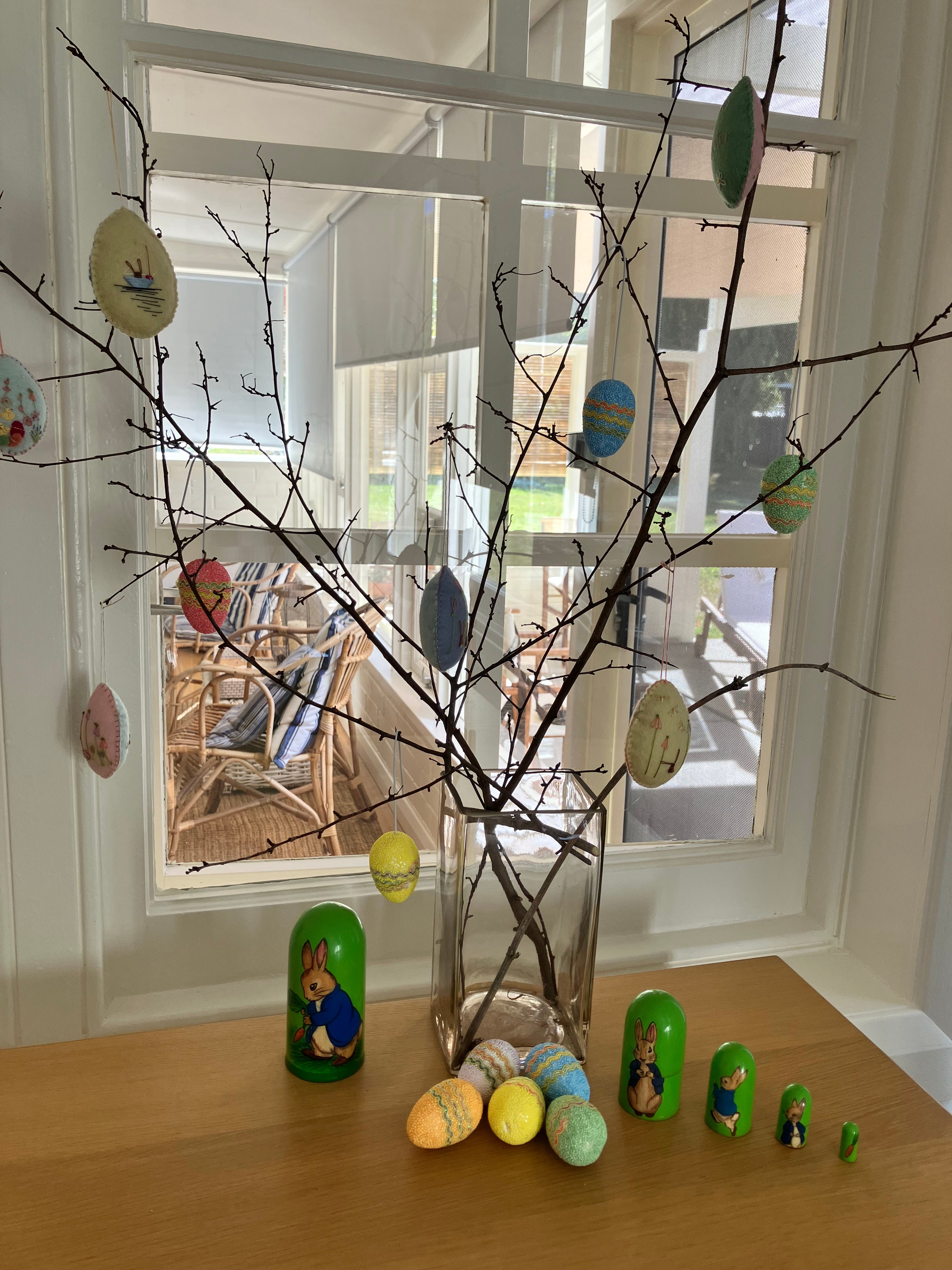 The Easter tree is decorated with an increasing number of handmade felt eggs. Some I stitched for last Easter and I have a few more to finish plus some to make as gifts. Every egg tells a whimsical little story and are a delight to stitch – choosing colours, deciding on the narrative, stitching away while the TV is off. The silence is profound outside of the city.