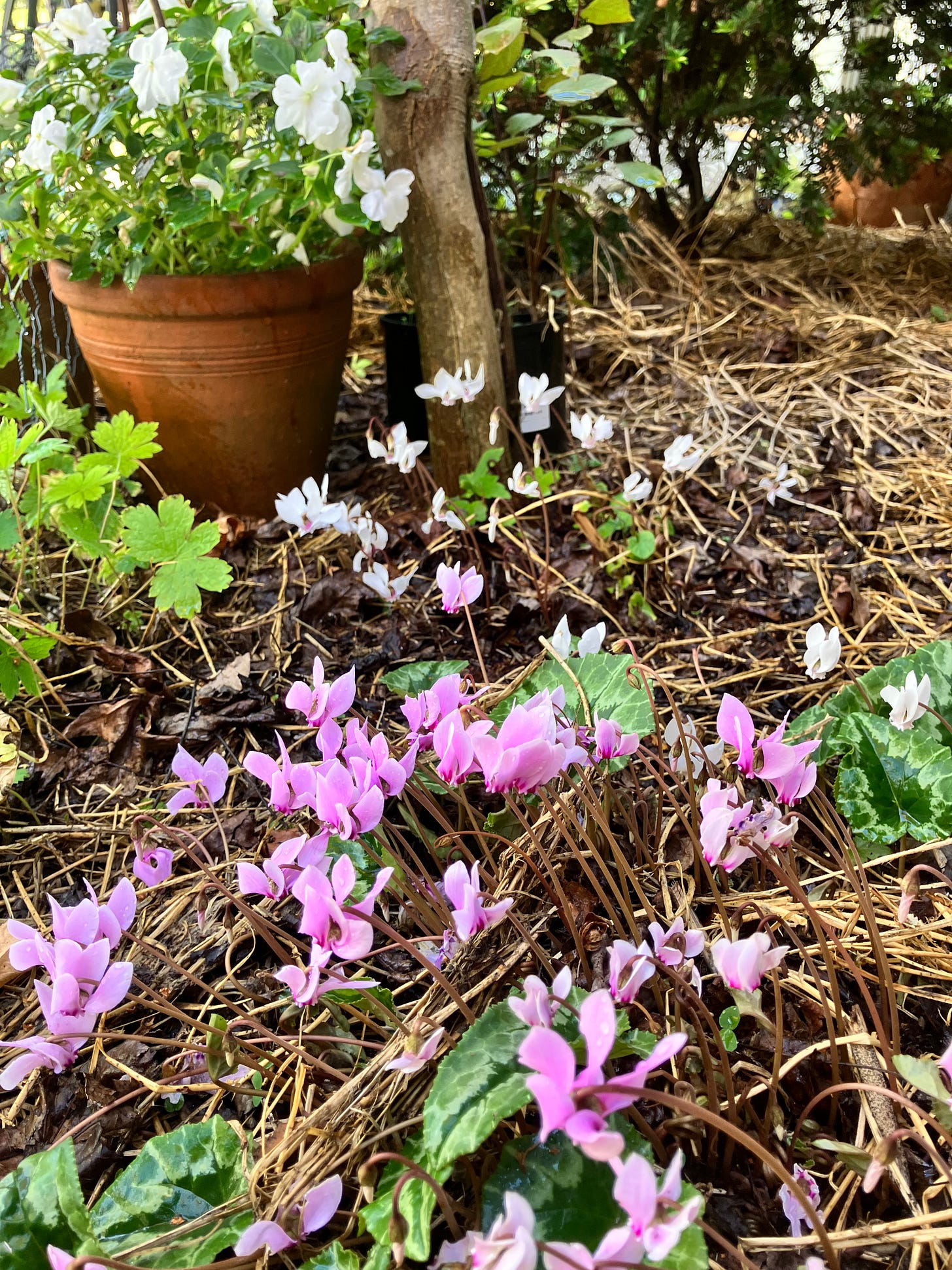 After day upon day of burning sun and pervasive heat, we had two days of delicious cool. Still wearing shorts of course, but with jumpers on and for the evening walk, dragging on leggings, runners and a padded vest. With a few leaves on trees and the miniature cyclamen predicting change.