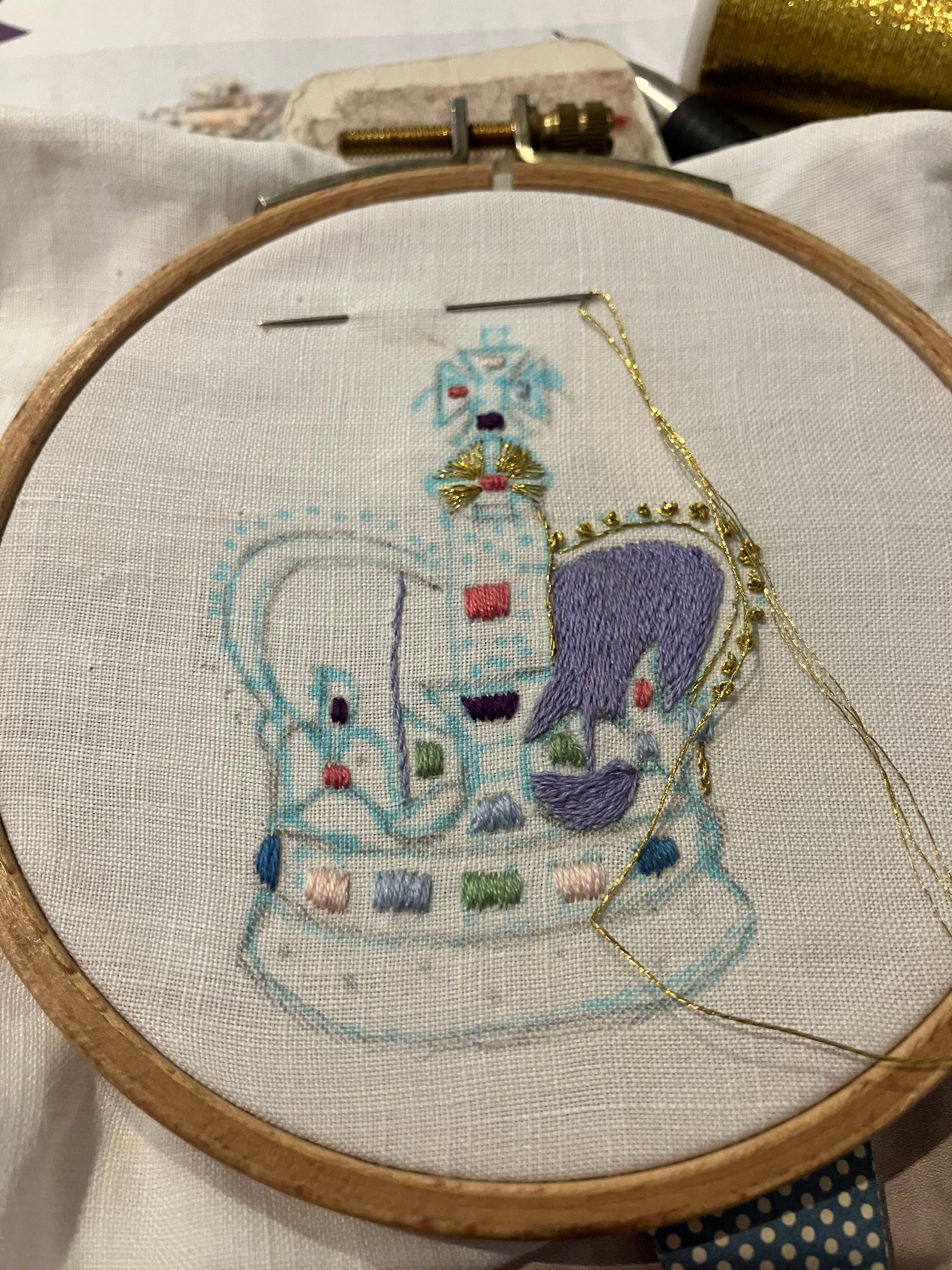 And so I take up some embroidery. I’m stitching the St. Edward’s Crown which will have a lush border of turkey knots at the base and meant to indicate the ermine.