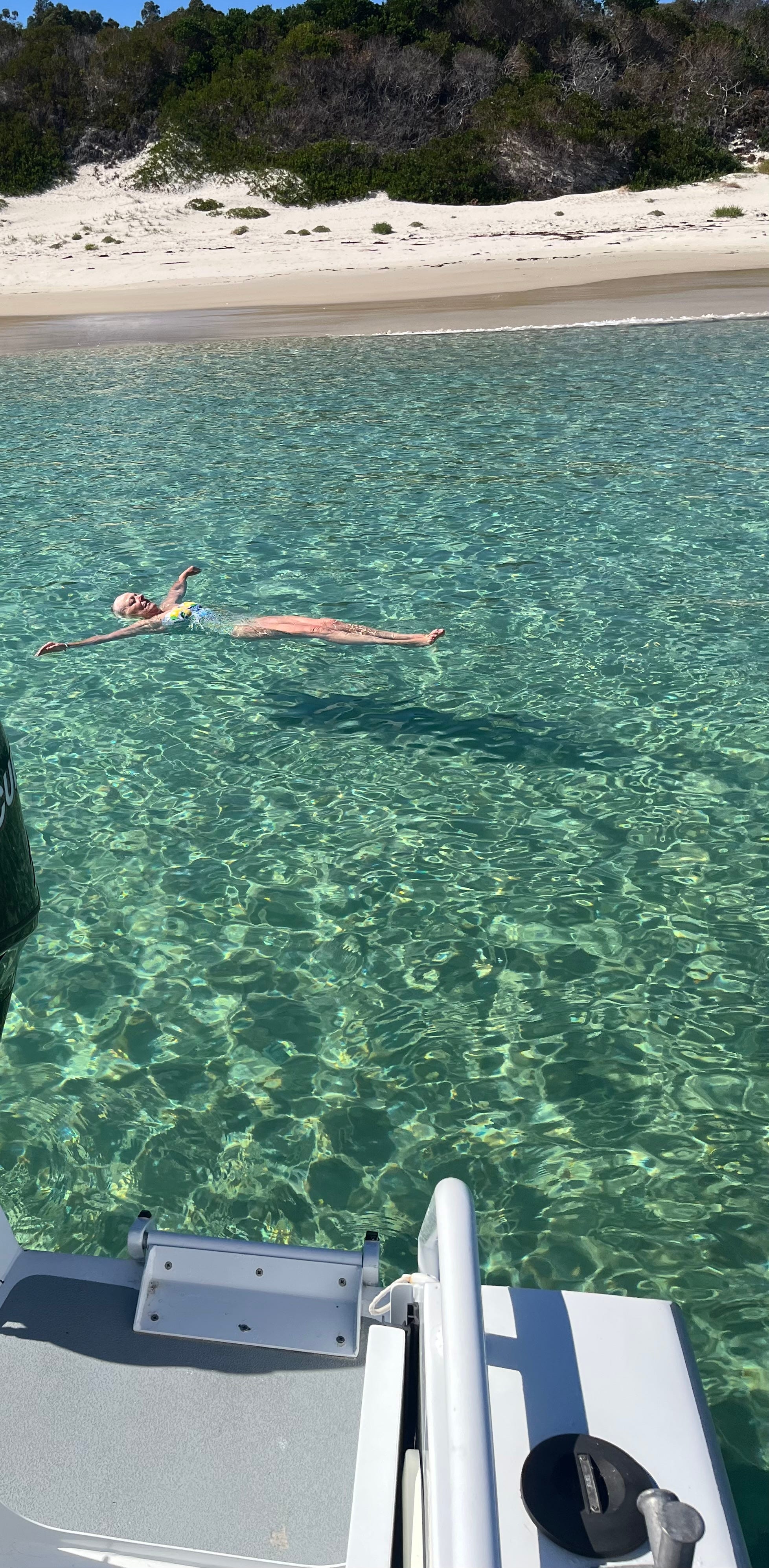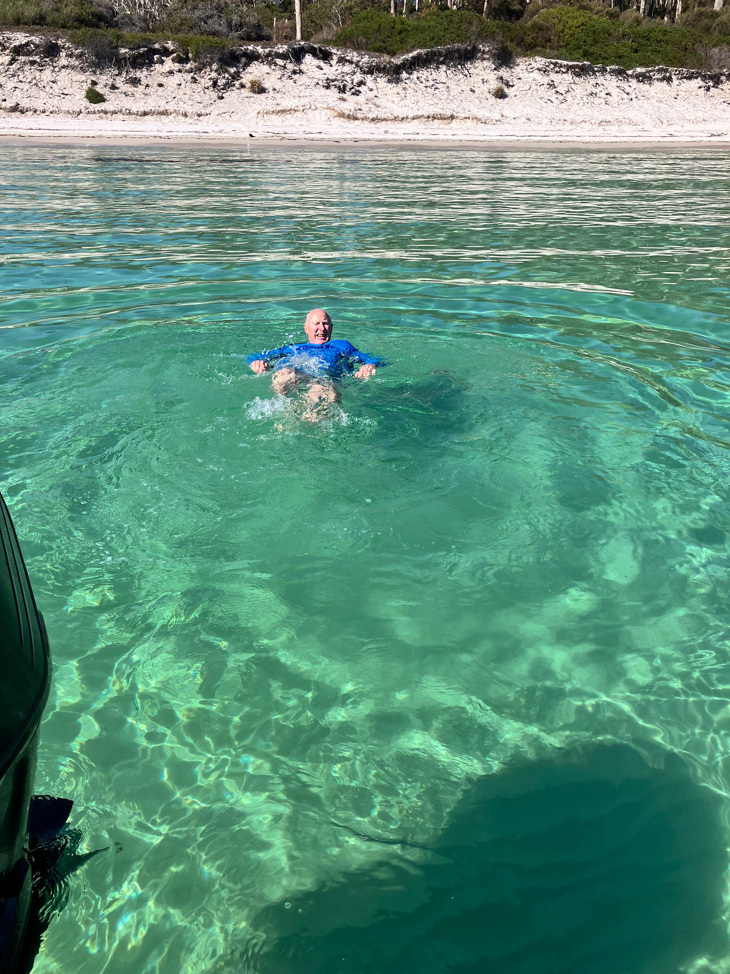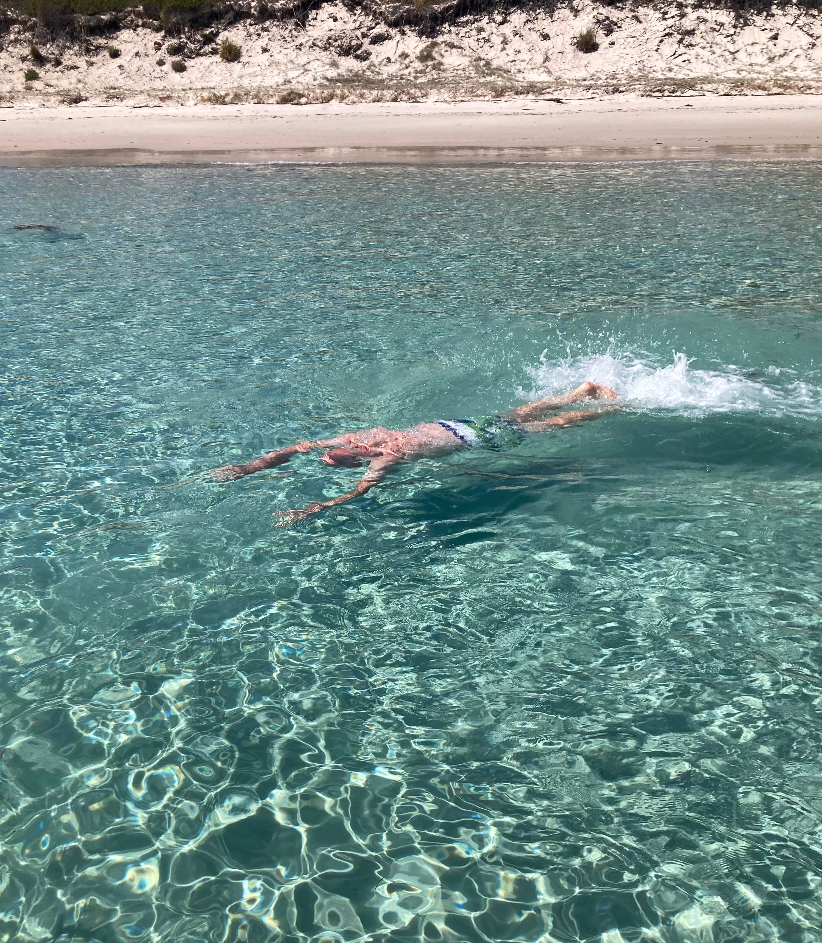 Later, we motor further to Return Point, round the corner to our son’s and grandson’s favourite beach. High sand dunes and a deeper shade of aquamarine but the same sand, the same depth. Odd. We swim again…