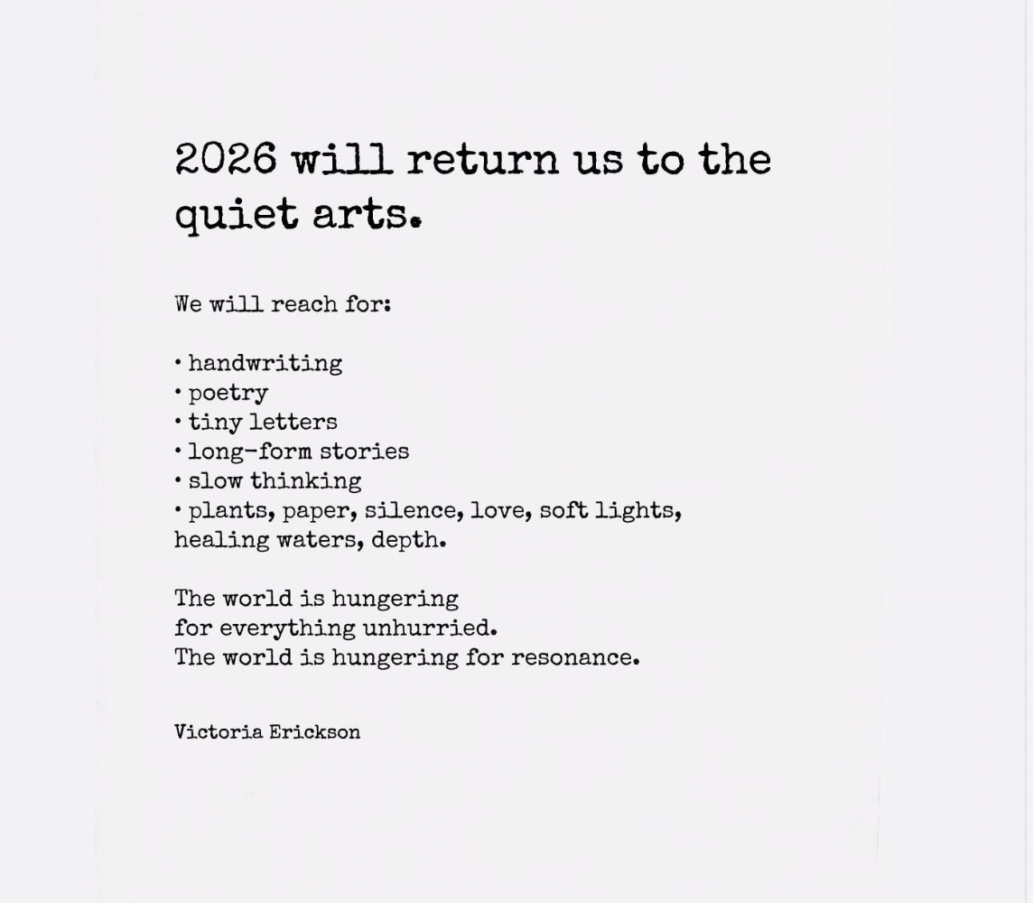 Online, there’s much talk that 2026 should be a ‘slow’ year. That we should take time to make time. Be soft in our spare moments – listen to gentle music for the soul, read slowly and long, not scrolling a paragraph here, a statement there. Steer clear of news media – it shatters the peace like a stone against glass. Ignore influencers because really, what are they when social media is taken away? When all is said and done, they are glorified advertisers, are they not? Make your own small choices in daily life with confidence. Move away from the group mentality. Learn to savour solitude – the peace that passes into the blood vessels and threads itself like silk through our bodies and minds.
